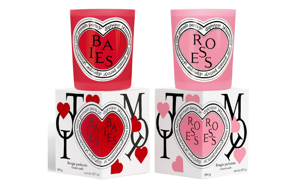 Le iconiche lettere danzanti di Diptyque si trasformano in un gioco tipografico elegante, mentre l’ovale distintivo del brand si reinventa in forma di cuori. Il tutto racchiuso in preziosi contenitori di vetro laccati nei colori simbolo della passione e della dolcezza: il rosso e il rosa. Un’estetica sofisticata che rende queste candele non solo un’esperienza olfattiva unica, ma anche un oggetto da collezione.