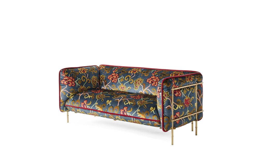 Spiccano, tra le proposte, i divani e le poltrone della linea REED, in cui la canna di bambù si fa struttura minimalista, dalla silhouette pulita e raffinata. I cuscini generosi, avvolti nei velluti floreali Etro come il disegno Nimphea, introducono una nota rétro e accogliente, mentre il piping a contrasto e il logo ricamato aggiungono quel tocco di lusso discreto che definisce l’identità del brand.