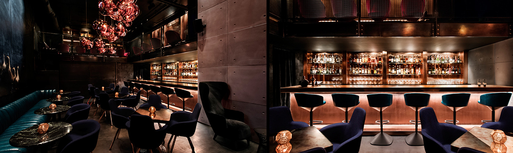 La palette cromatica di fondo è super dark, con predominanza del color petrolio ed impreziosita dalla brillantezza di metalli come il rame o l’acciaio cromato, per un ambiente davvero riservato. Le sedute avvolgono in un delicato velluto e i divani sono in morbida pelle combinata a materiali naturali; il tutto all’interno di uno spazio industriale con dettagli strutturali a vista.