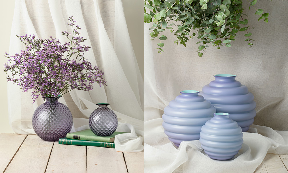Le trasparenze del vetro raccontano i movimenti impercettibili dell’acqua, la delicatezza dei fiori mossi dal vento, il respiro lento della natura. Il lilla e la menta sono i protagonisti di questa palette raffinata. Il lilla, tenue e romantico, richiama le fioriture del Limonium e il loro modo di catturare la luce con discrezione, quasi sospesa. È un colore che suggerisce introspezione, un invito alla calma e alla contemplazione. La menta, invece, spezza la quiete con un tocco brillante e vitale: una sfumatura fresca, cristallina, che illumina la superficie del vetro e ne amplifica la profondità.