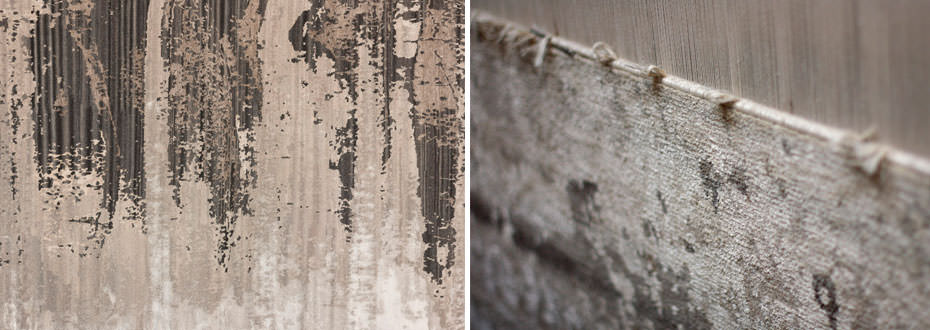 Il tappeto realizzato è davvero meraviglioso. La scelta stilistica realizzata insieme a CC Tapis è stata quella di utilizzare, nell’intreccio, cinque diversi materiali: lana di capra himalayana, juta, aloe, seta da baco indiana e seta di banano. Tutti questi fili, lasciati volutamente al naturale, senza alcun tipo di trattamento, presentano le diverse sfumature del bianco e del beige e, naturalmente, diverse consistenze al tatto. La ruvidezza e l’opacità della juta contrasta con la morbidezza e lucentezza della seta, soprattutto quella di banano, particolarmente sensibile ai riflessi di luce e quindi molto brillante.