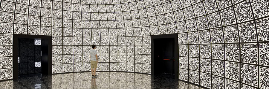 Salendo al secondo piano del padiglione russo alla Biennale di Venezia si compie un balzo nel futuro. L’enorme cupola palladiana dell’edificio, così come le altre stanze, è interamente ricoperta di codici QR: i tablet consegnati all’ingresso permettono di scansionarli, esplorare virtualmente i paesaggi e i progetti che sono stati selezionati per la mostra e accedere alle informazioni. Un viaggio nel quale immagini e video appaiono in sequenza casuale ad ogni attivazione del codice QR corrispondente, ricostruendo ogni volta nuove sequenze logiche e narrazioni sempre diverse.