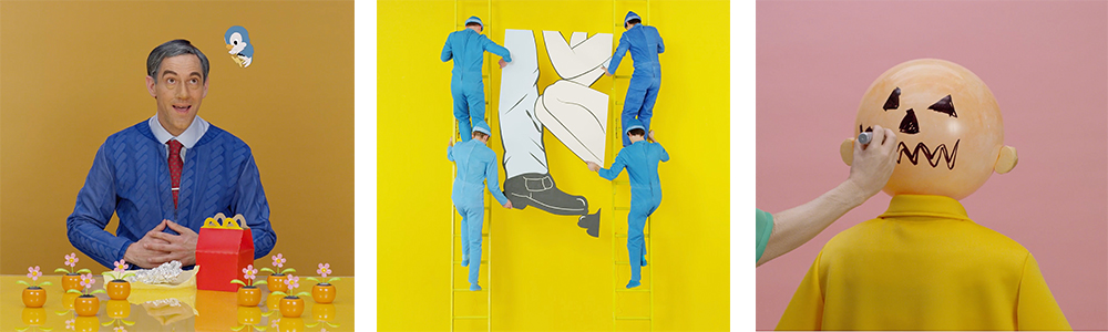 Lo spazio per la mostra, creato interamente dall’artista, è frammentario e dai colori vivaci, come un viaggio onirico in cui l’unico desiderio è quello di “sfondare lo schermo e toccare ciò che è rappresentato”. Questo desiderio per la prima volta può essere soddisfatto: è lo stesso artista che si trasforma in pupazzi come la Pantera Rosa o Gatto Silvestro.