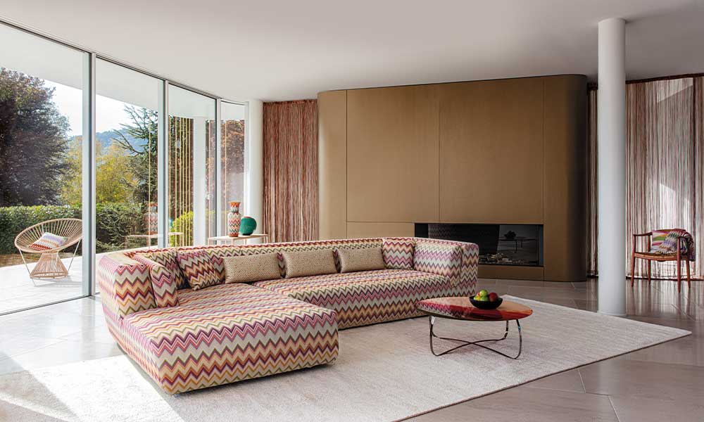 Che si tratti di texture, linee, decori o materiali, l’intera collezione firmata Missoni non smette di essere un incanto nella sua capacità di creare un’atmosfera impregnata di personalità avvolgente e altamente riconoscibile. Che tu sia sdraiato su un morbido tappeto circondato da simboli cosmici astrali, oppure su un sofà rivestito di decori floreali, chiudi gli occhi: ti troverai a danzare tra le stelle e rotolarti in un immenso campo nel bel mezzo di una fioritura primaverile. Esplosione sensoriale tattile e visiva, un marchio di fabbrica Missoni.
