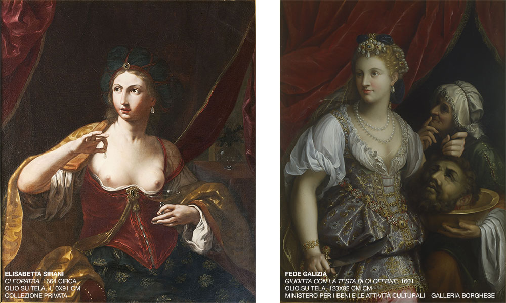 Sempre bolognese, la pittrice Elisabetta Sirani dà un esempio a tratti nudo e crudo della condizione infelice della donna del tempo. La ribellione alla violenza maschile è particolarmente visibile in “Porzia che si ferisce alla coscia” e in “Timoclea uccide il capitano di Alessandro Magno”. Ma lo stesso sanguinario messaggio lo si ritrova anche nel quadro di Fede Galizia “Giuditta con la testa di Oloferne”. Una testa senza vita che per l’appunto giace in un recipiente dorato. E in recipienti giace anche talvolta l’arte di Giovanna Garzoni, che prediligeva il cibo come soggetto artistico, presente alla mostra con rare pergamene.