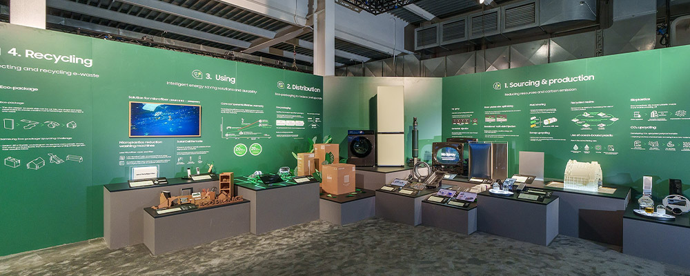 La Zona Sostenibilità esplora le soluzioni eco-compatibili. Viene svelata una panoramica generale in merito ai vari momenti del ciclo di vita del prodotto: dalla produzione alla distribuzione e poi ancora all’uso e al riciclo. La collaborazione con l’artista Seungji Mun dimostra l’importanza della sostenibilità tramite l’utilizzo di materiali riciclati.