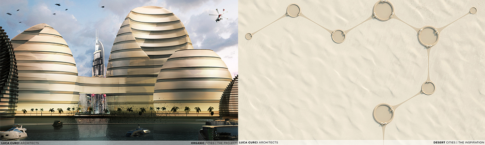 “Organic Cities” è un progetto che mira alla realizzazione di vere e proprie “città organiche”. La loro peculiarità è di essere in completa armonia con l’ambiente, senza mancare di nulla. Le città organiche progettate da Luca Curci Architects dispongono, infatti, di zone residenziali, negozi, distretti economici, aree di svago, benessere e siti culturali. Il progetto, che ambisce a diventare il fulcro dello skyline del Golfo Persico, si articola in due complessi costruttivi, connessi da infrastrutture. Sulla terraferma sono i “Palazzi Organici”, mentre le “Lune” si affacciano sul mare.