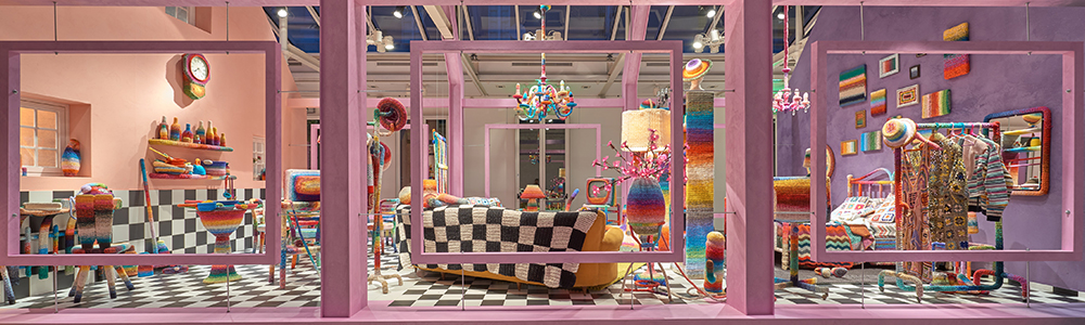 Alessandra Roveda con semplici fili colorati ridisegna lo spazio e la concezione degli elementi di arredo. Allestendo nello Showroom Missoni Home di Viale Elvezia un interior ricoperto in ogni sua parte di maglia, dando vita ad un ambiente fiabesco pronto a trasportare lo spettatore all’interno di un mondo parallelo, privo di regole e consistenza.