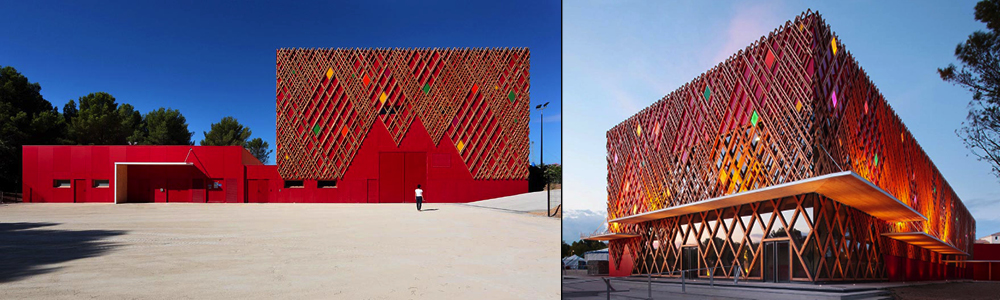 Gli architetti Bonon, Cervantes e Gal dello studio A+Architecture, ad esempio, hanno sposato una visione a basso impatto ambientale per la realizzazione del Teatro Jean-Claude Carrière di Montpellier. In uno spazio pubblico immerso nel verde delle pinete del Domaine d’O, è stato inserito un eccellente esempio di costruzione in prefabbricato completamente smontabile e riutilizzabile, dall’estetica giocosa a rombi che si ispira alla tipica maschera di Arlecchino. Il legno certificato garantisce un perfetto isolamento termico ed acustico, per un’ottima riuscita degli spettacoli all’interno; esternamente, le aste di legno grezzo si intrecciano creando un pattern a rombi, intervallato a vuoti e pieni di colore, e scintille di luce notturna a diamante.