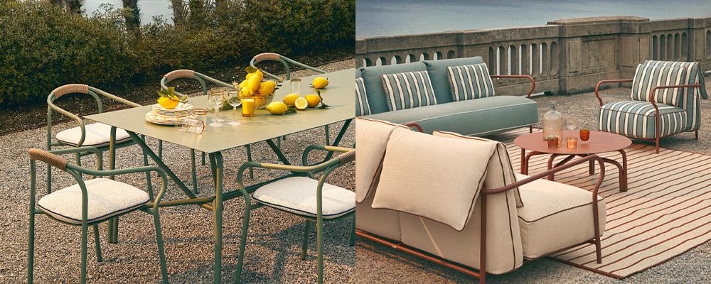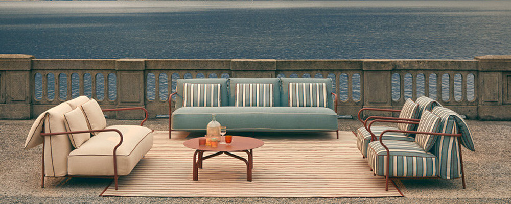 Lettini, poltrone, divani, tavoli e sedie compongono una collezione versatile e raffinata, realizzata in alluminio verniciato nelle nuance di terracotta, sabbia, salvia e grafite, a evocare le tonalità calde e rassicuranti della natura. I tessuti di altissima qualità firmati Dedar, Loro Piana e Mariaflora aggiungono un tocco sartoriale, rendendo ogni pezzo unico e accogliente.