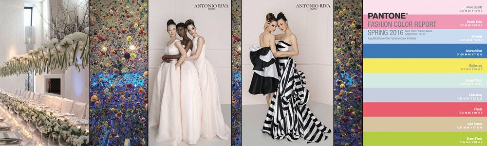 Passiamo ora ai colori del 2016, e come ogni anno, Pantone ha selezionato quelli che andranno maggiormente di moda nella primavera\estate del prossimo anno, e quindi anche i colori più utilizzati per i matrimoni del 2016: Rose Quartz, Peach Echo, Serenity, Snorkel Blu, Buttercup, Limpet Shell, Lilac Gray, Fiesta, Iced Coffee, Green Flash.