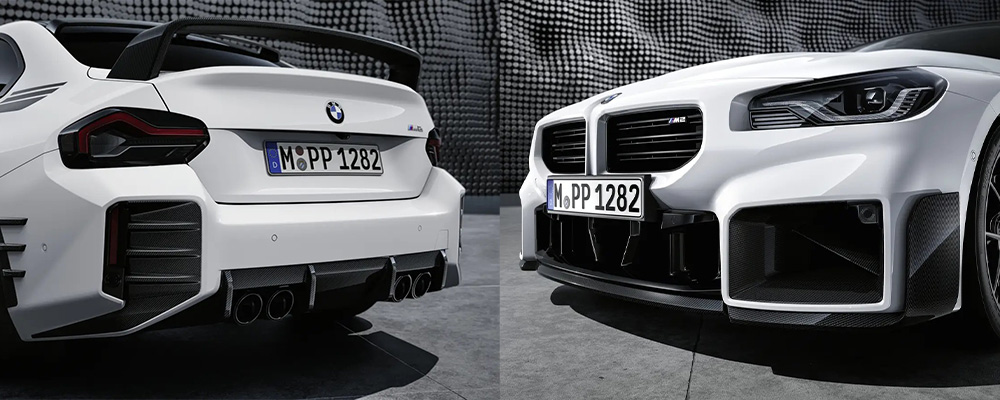 La nuova BMW M2 presenta un aspetto esteriore molto sportivo e affilato nella forma. Le componenti aggiuntive per il frontale, le fiancate del modello a due porte e la parte posteriore dell’auto sono realizzate in resina rinforzata con fibra di carbonio. Contribuiscono a conferire all’auto le sue proprietà aerodinamiche e sportive i numerosi componenti esterni. Tra questi ricordiamo gli attacchi delle minigomme laterali M Performance Carbon e l’attacco anteriore M Performance Carbon. Anche il diffusore posteriore M Performance Carbon e lo spoiler posteriore M Performance Carbon concorrono nel conferire l’aspetto sportivo e aerodinamico a questo gioiello dell’automobilistica.