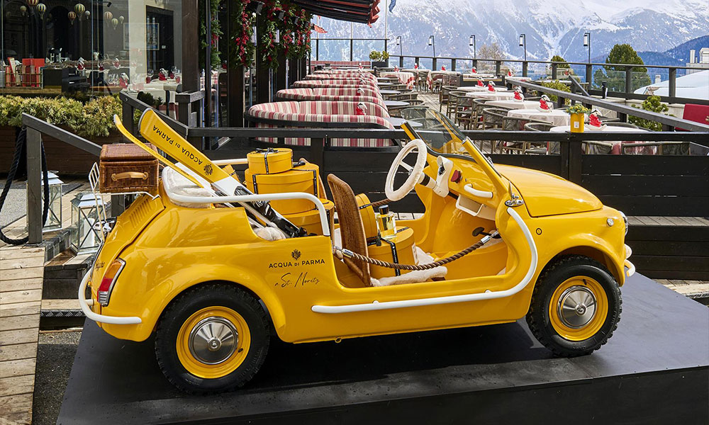 La Fiat 500 Jolly Spiaggina sa come conciliare l’atmosfera estiva tipica dell’auto con quella dell’après-ski di montagna. L’auto si tinge di giallo, tonalità tipica e iconica di Acqua di Parma, che riprende anche quella del sole italiano. La vettura risulta molto lussuosa grazie ai sedili in rattan ricoperti da ecopelliccia. Sul retro dell’auto, un cesto sempre in rattan contenente i Car Fragrance Diffuser Acqua di Parma.