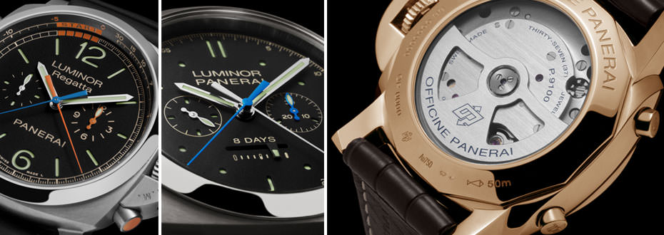 La cassa del nuovo Luminor 1950 3 Days Chrono Flyback misura 44mm di diametro ed è a tenuta stagna fino a 10 atmosfere (circa 100 metri), oppure cinque atmosfere (circa 50 metri) nella versione in oro. Sul retro della cassa, il fondello a dodici lati ha al centro un largo oblò in vetro zaffiro che permette di osservare il movimento di manifattura P.9100, il primo calibro cronografico a carica automatica sviluppato e realizzato da Officine Panerai a Neuchâtel. Il Luminor 1950 3 Days Chrono Flyback e il Luminor 1950 3 Days Chrono Flyback Oro Rosso fanno parte della collezione Contemporary e sono corredati da un cinturino in pelle nera nella versione in acciaio e in alligatore marrone per quella in oro rosso. Con cronografo a innesto verticale e ruota a colonne, il nuovo calibro è caratterizzato, oltre che dal datario, dal conteggio dei minuti visualizzato mediante una lancetta centrale, che compie uno scatto ogni sessanta secondi, e dall’utile funzione flyback.