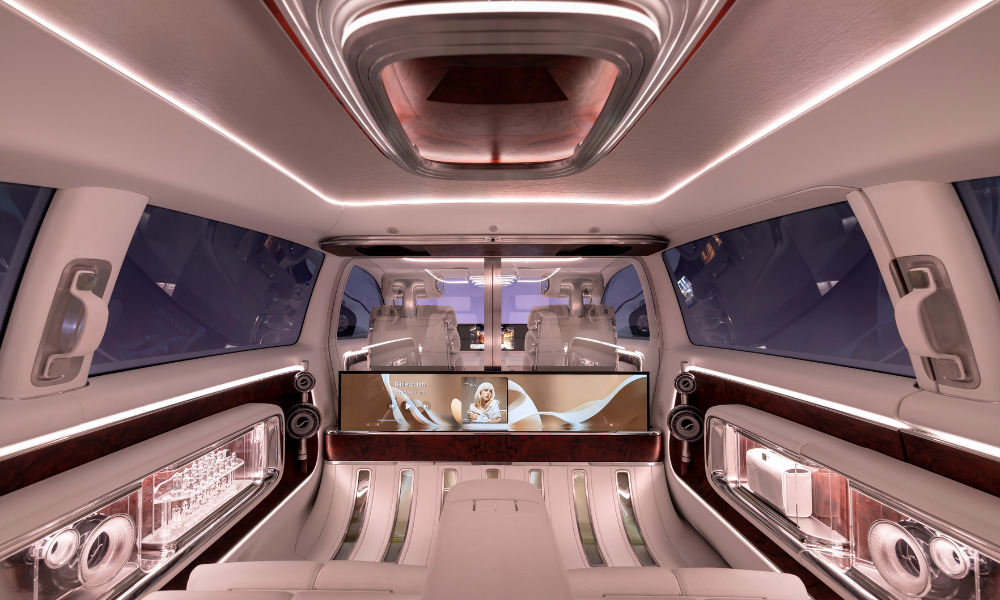 All’interno, il Vision V offre un ambiente lussuoso e tecnologicamente avanzato. L’accesso alla zona posteriore è facilitato da una porta laterale automatica e da una pedana retrattile illuminata. La “Private Lounge” è separata dalla cabina di guida da una parete di vetro intelligente, che può diventare opaca per garantire privacy. I sedili posteriori, ispirati alle poltrone di prima classe, sono rivestiti in pelle Nappa bianco cristallo e possono essere completamente reclinati. La console centrale include un touchpad per il sistema di infotainment e un tavolino pieghevole, mentre le vetrinette laterali offrono spazio per accessori personali.