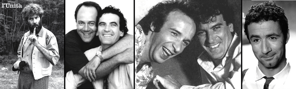 bruttino, con un forte accento romano, ma sembrava colto, molto colto, eppure si burlava di tutti calzando a pennello i panni dell’italiano medio. Alle sue spalle, anticipato da un forte odore di poesia napoletana, sedeva un signorino magro magro ed alto, un po’ malaticcio a dir la verità, anche lui strepitante ed eccitato, non vedeva l’ora di scendere da quel catorcio scricchiolante. Dagli ultimi posti del camioncino, forti e impregnati di ilarità, arrivavano schiamazzi e burle tipicamente toscane, dirette dai quei tre “bischeri” là in fondo verso l’autista e gli altri due compagni di viaggio. In quel trio, spiccava, per il frizzante spirito ribelle e il potenziale comico di quel corpicino striminzito, un tipetto tutto pepe dai capelli scapigliati e il vestito più grande di almeno tre taglie. Giunti a destinazione, uno dopo l’altro, a partire dal romano ed a seguire tutti gli altri, scesero uno ad uno quei guitti troppo poco silenziosi, che per tutto il viaggio non fecero, chi in un mondo chi in un altro, altro che ridere e schiamazzare qua e là chi intravedessero dal finestrino. Erano arrivati, erano proprio loro, unici come non mai, i salvatori della Comicità Italiana. Erano gli anni’80 e quei cinque personaggi in cerca di successo rispondevano al nome di Carlo Verdone, Massimo Troisi, Alessandro Benvenuti, Roberto Benigni e Francesco Nuti”