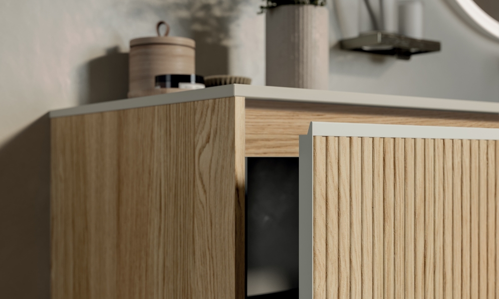 Elemento centrale della collezione è il legno, protagonista di un racconto che unisce ricerca tecnologica e sensibilità artigianale. Grazie a una avanzata lavorazione tridimensionale, i frontali  caratterizzati da uno spessore estremamente contenuto  assumono identità differenti attraverso superfici scandite da doghe verticali oppure da texture più materiche e irregolari.