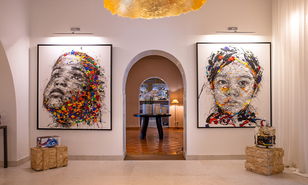 A Villa Calvi non manca infine la passione per l’arte, che ormai da anni è diventata la cifra stilistica di questo resort contemporaneo. Iniziò tutto per caso 15 anni fa, quando una coppia di clienti e amici cechi chiese a Jean-Pierre e alla moglie Marion di appendere alcuni quadri. Da quel giorno, quello che era stato un caso, diventa un rituale di successo. Alcune sale si trasformano in una vera e propria galleria d’arte nel cuore dell’hotel, dove gli artisti contemporanei vengono invitati a esporre da Antoine, figlio di Jean-Pierre. La clientela viene rapidamente conquistata dalla selezione accurata e coerente di una dozzina di artisti: Fred Allard e le sue inclusioni di accessori di lusso, Hom Nguyen per i suoi ritratti in acrilico, carboncino e china, Jérôme Revon per i suoi assemblaggi di stampe fotografiche, Stéphane Cipre e le sue sculture in alluminio.