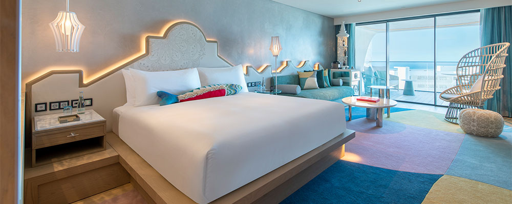 Le 134 camere dell’hotel sono caratterizzate da uno stile definito “massimalismo sobrio”. Arredate da mobili realizzati su misura e oggetti locali, come le lanterne in filigrana sui comodini o le testiere dei letti retroilluminati, la cui forma ricorda le chiese portoghesi. La vista dai balconi che si affacciano sui giardini e sulla costa atlantica è mozzafiato. Le dieci WOW Suite possono inoltre vantare di un rooftop dove ammirare spettacolari panorami.