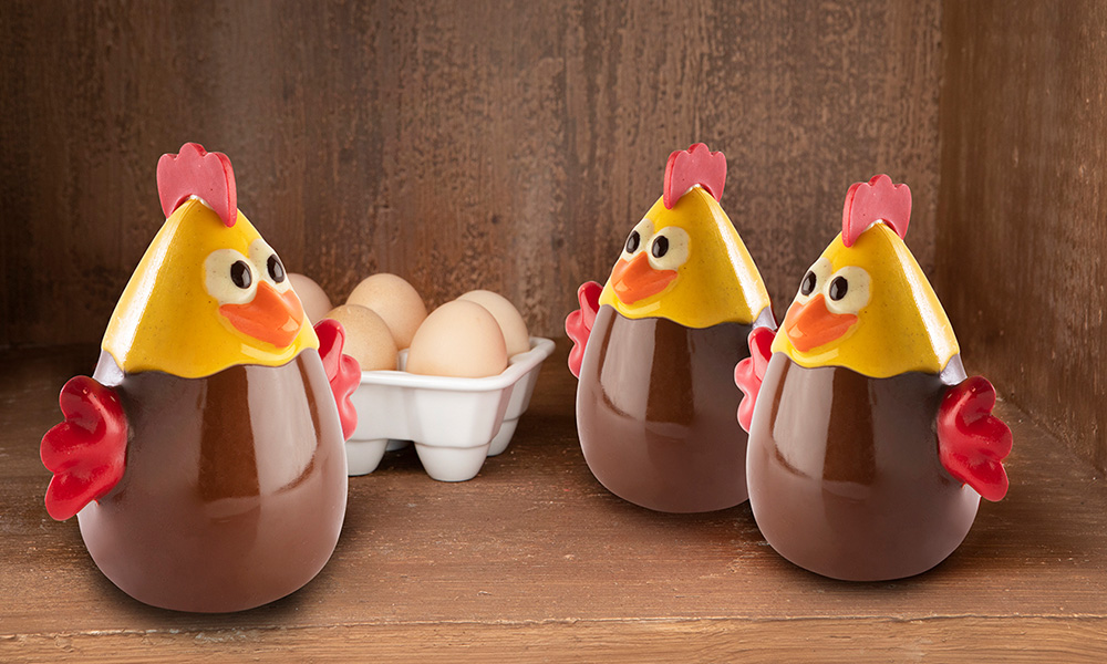 Un cioccolato pregiato che compone anche le creazioni dei più piccoli, come l’allegro Maialino Oscar, realizzato a mano in cioccolato fondente 58% e con sfumature di colore che vanno dal giallo al rosa. A completare il trio ci sono gli allegri Brandy e Bijoux, due coniglietti colorati disponibili in cioccolato fondente e al latte. Ritornano anche l’amorevole Mamma Chioccia e il simpatico Coniglio Ernesto, insieme alle tenere paperelle e al pulcino paffutello. La vasta selezione di animali pasquali fa ritorno con il Frau Coniglio dalle guance grandi e tutte da mordere.