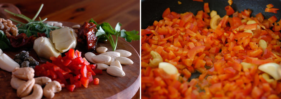 Tagliate a micro cubetti i peperoni precedentemente lavati, fate saltare gli anacardi con un filo d’olio, aggiungete i peperoni e fate cuocere una decina di minuti, aggiustate di sale, aggiungete il prezzemolo fresco tritato. Fate raffreddare quindi frullate tutto con un mixer ad immersione.