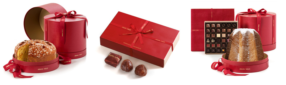Accanto al Panettone, il Pandoro dalla pasta molto soffice e la Veneziana, ottimi da abbinare alle creme o alla cioccolata in tazza Armani/Dolci. Nulla è lasciato al caso, e il marchio non dimentica le sue origini vestendo i prodotti da forno con sofisticate cappelliere, mentre cioccolatini, praline, dragées e marron glacé sono dolcemente racchiusi in confezioni dal nastro rosso con logo oro in rilievo.