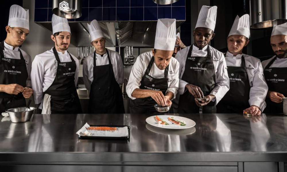La ricerca degli ingredienti è meticolosa e in linea con la modernità, senza mai dimenticare il fascino delle ricette del passato. Grazie alla cura dell’ambiente e della cucina, nel Novembre del 2020 Re Santi e Leoni riceve l’ambito riconoscimento della stella Michelin, un nuovo sogno che si realizza. A rendere possibile tutto questo è lo chef Luigi Salomone, che con il suo talento e la sua esperienza, che vede gli esordi già nell’infanzia, riesce a proporre nei suoi piatti esplosioni di sapori che raccontano di avventure, di meticolosi studi e di curiosità.