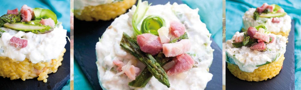 Terminate aggiungendo sopra: qualche cubetto di pancetta (tenuto da parte in precedenza), le punte degli asparagi alla piastra e una rosa di asparagi crudi, formata con un paio di “tagliatelle” d’asparago ricavate con il pelapatate, avvolte tra di loro formando un fiore.