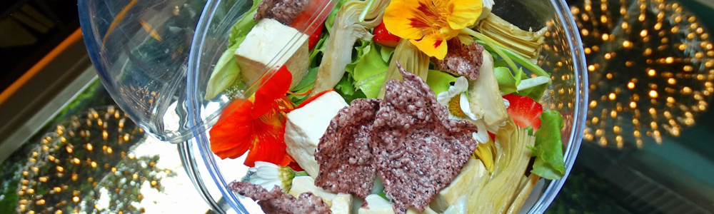 Posizionare alla base della mezza sfera di plexiglass la misticanza, dunque unire gli altri ingredienti, guarnire con le cialde soffiate di riso nero venere, condire ed infine richiudere la ball. Servire.