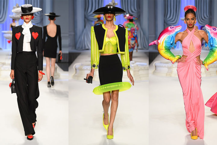 Moschino, in ogni dettaglio della sua collezione, è elegante, sofisticato e ci riporta allo stesso tempo in un mondo surreale e nel passato