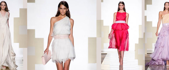 Alberta Ferretti propone una nuova donna in equilibrio tra contrasti cromatici e femminilità.