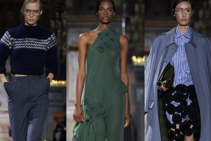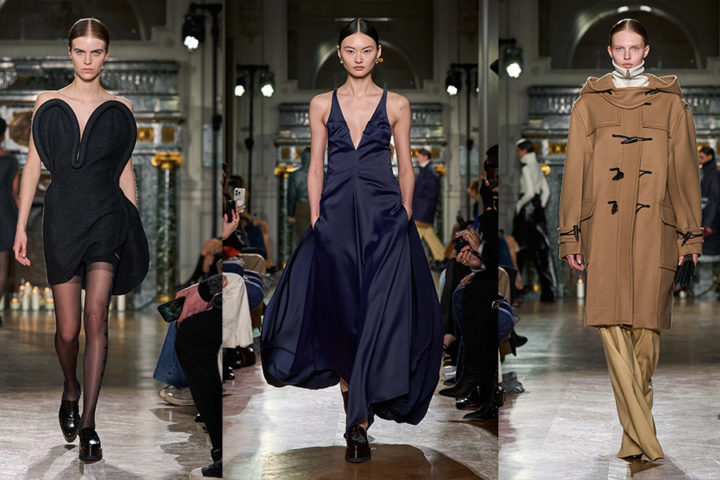 La collezione ha proposto una rivisitazione della sartorialità classica, con abiti midi dagli orli asimmetrici, cappotti oversize dalle linee scultoree e completi pantalone impeccabilmente
